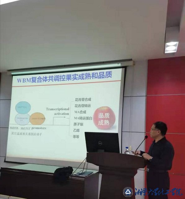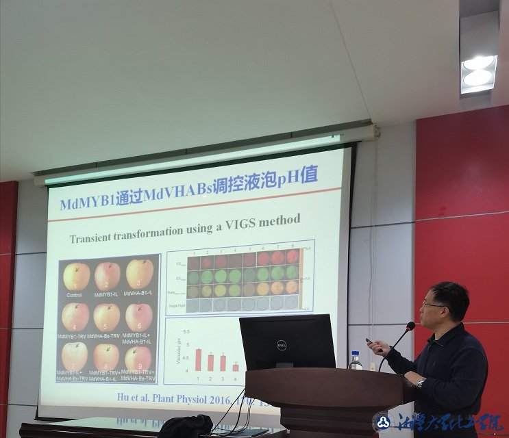 郝玉金教授此次报告的主题是:苹果果实成熟和品质的共调控,报告主要介绍了调控苹果果实成熟的两个因子MdMYB1和MdbHLH3,以及分析了两个因子如何实现最终对苹果果实成熟和品质的协同调控。苹果果实的成熟主要有叶绿素降解、花青苷积累、可溶性糖积累和乙烯释放过程。MdMYB1/10是调控花青苷合成和果实着色的关键转录因子,而液泡的pH值影响花青苷的显色,因此MdMYB1通过MdVHABs调控液泡的pH值从而对花青苷的合成进行调控,来控制苹果果实的色泽。郝教授提到在研究过程中还发现了另外一种因子即MdbHLH3也可以调控花青苷合成,MdbHLH3通过MdcyMDH调控苹果酸,可以调控果实成熟和叶片衰老,也能激活乙烯相关基因表达,从而MdbHLH3调控乙烯合成和果实成熟,最后得出,WBM复合体共调控果实成熟和品质。
