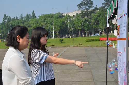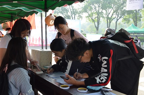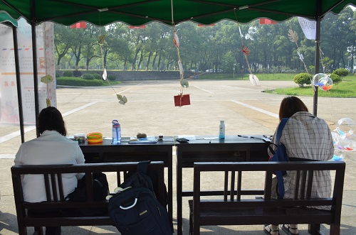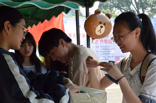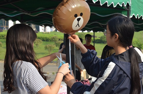 摆点值班人员齐心协力布置好现场后,便陆续有人前来询问。值班人员细致地向他们介绍活动内容,指导他们填信息表、写明信片,为他们将信件密封。活动参与者均可获得一次玩游戏抽奖的机会,投壶、颠乒乓球,小游戏趣味多;多肉、耳夹……各种各样的小礼物激起大家参与游戏的热情。