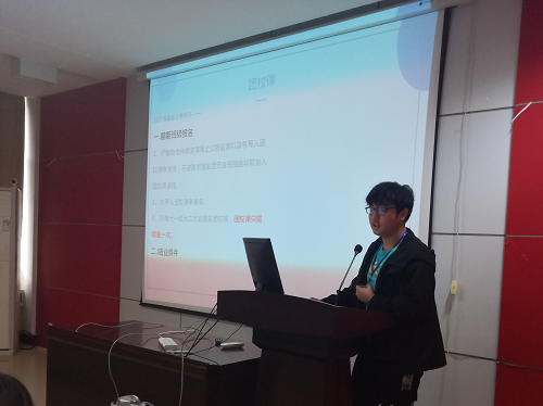 (图为以诚为本赢在信誉9001cc团委组织部副部长高梓奥讲解团校培训工作)