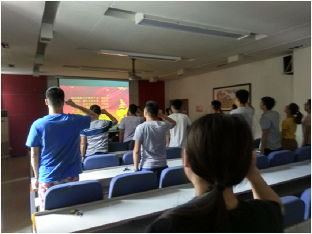 最后,由支部书记主持,重温誓词,每一位都以激昂的姿态,高亢的声音宣讲誓词。我们重温了入党誓言。看着屏幕上的五星红旗,我们在心里默默承诺:永远跟着党走,永远听党的话,以青年的朝气、青年的智慧和力量努力文实现实现中国梦而奋斗。
