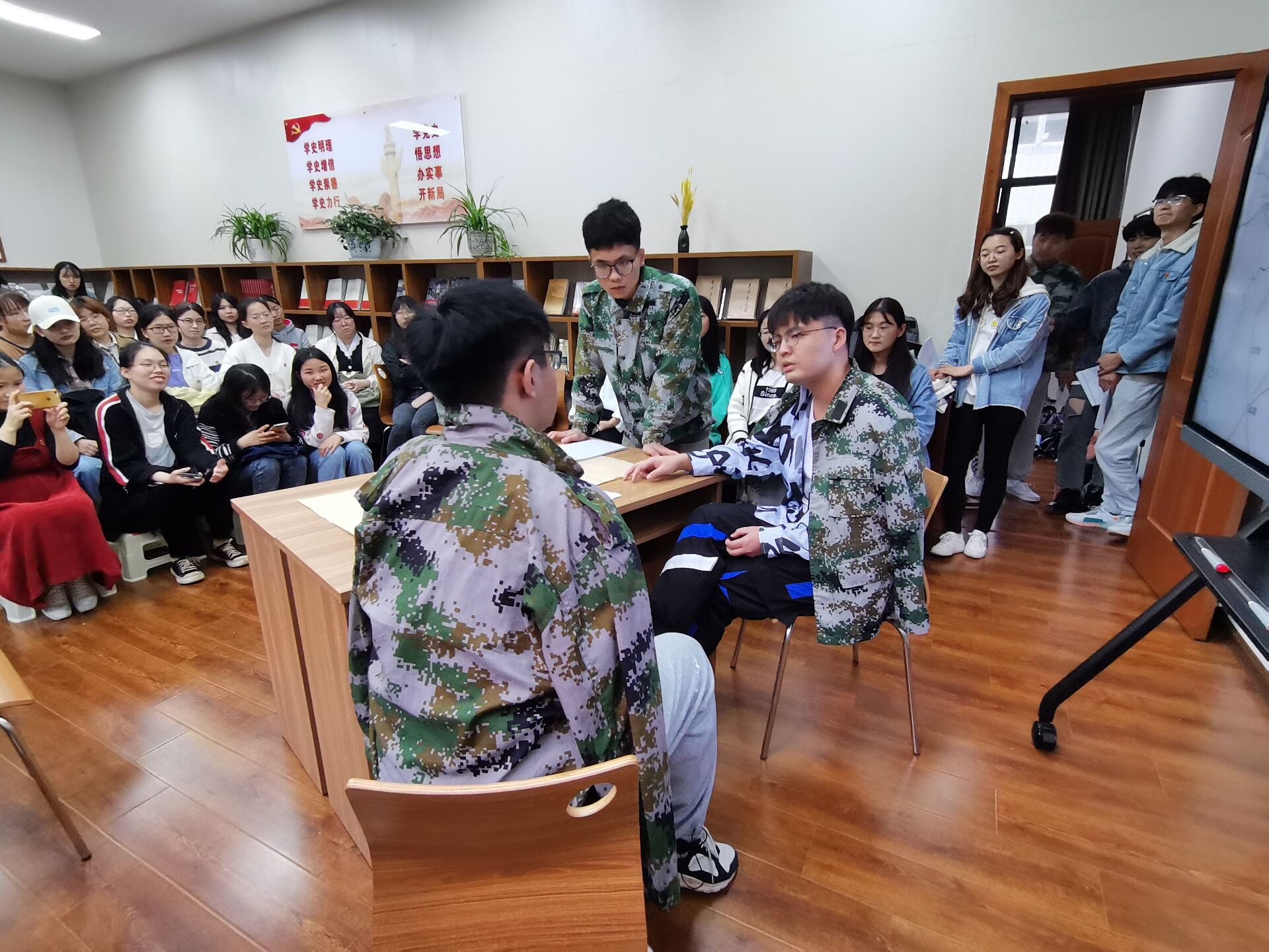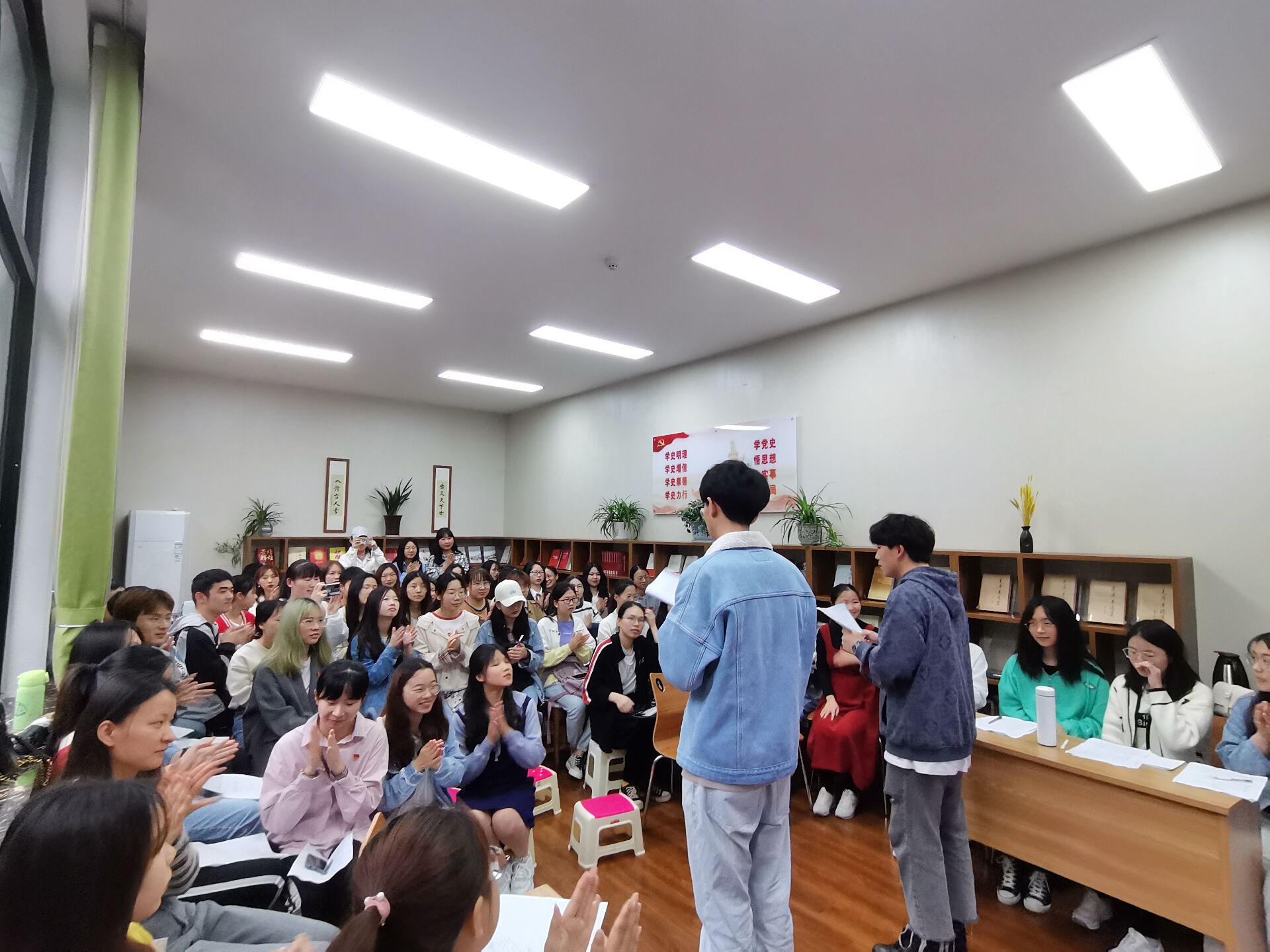 此次活动以红色故事会的方式选读了《中国共产党简史》第四章夺取新民主主义革命的全国性胜利。重庆谈判场景再现,让大家深刻感受到了革命领袖敢于斗争、善于斗争的大智大勇;少年英雄周银海的故事讲解,让大家学习到了革命先辈英勇斗争不怕牺牲的奉献精神;淮海战役和渡江战役片段重演,让大家了解到了战争背后鲜为人知的故事和战争的残酷性;诗朗诵“不朽”震撼人心,大家反应十分热烈,掌声不断。