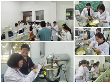 活动第三项,与会党员在车书记的带领下参观了生物与食品工程系的重点实验室,之后与会人员亲自体验了制作奶酪蛋糕的具体操作过程。车书记也是此次体验活动的指导老师,他首先向各位党员介绍了制作奶酪蛋糕的秘方,很详细介绍了制作过程和制作过程应该注意的事项,然后把与会党员分成四组,每组3—4人,每组党员同志积极地按秘方要求进行选料、称料、配料、制料,车书记不停地在每小组中穿梭作指导,累得他汗流浃背,针对制料失败了的党员同志,就分析他们失败原因,然后和他们一起重作。各位党员同志们的制作热情高昂,看到自己制作出的成品,有的有点小失望,不太令人满意;有的好开心,有点不敢相信这是自己制作出来;有的就分析在哪个过程中应该怎么做会更好……。