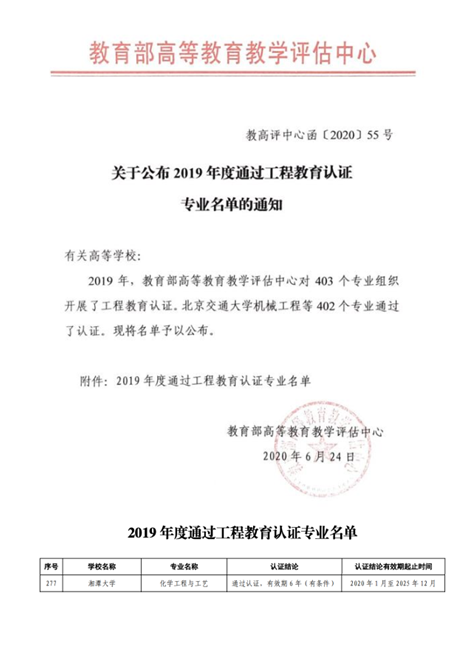 近日,根据教育部高等教育教学评估中心正式公布的《关于公布2019年度通过工程教育认证专业名单的通知》(教高评中心函〔2020〕55号)和中国工程教育专业认证协会正式公布了《关于公布北京交通大学机械工程等402个专业认证结论的通知》(工认协〔2020〕15号),我院化学工程与工艺专业再次通过工程教育专业认证,有效期为6年(有条件),即2020 年1月至2025年12月。
