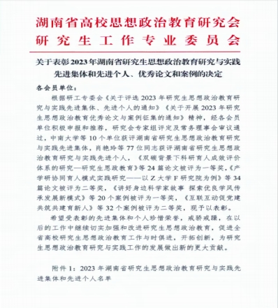 喜报!我院周心恺老师荣获2023年湖南省研究生思想政治教育研究与实践先进个人