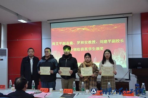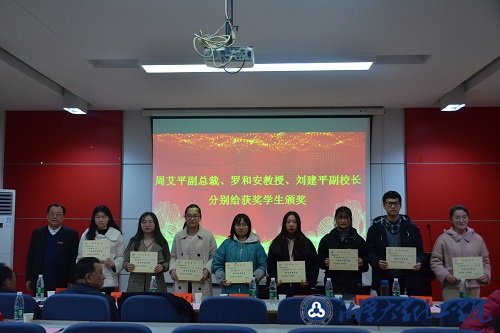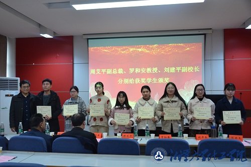 在罗和安教授宣读了2019年度湘潭大学“新宙邦“奖学金获奖名单后,周艾平副总裁、罗和安教授、刘建平副校长分别为获奖学生颁奖。