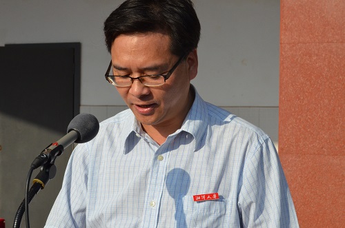 大会伊始,副校长廖永安发言。“流血流汗不流泪,掉皮掉肉不掉队”,他表达了对2019级新生的希冀,希望他们能够在军训的过程中增强体魄、磨练意志,提高自己的思想认识,把自己培养成德智体美劳全面发展的社会主义建设者和接班人。同时他也对2019级新生的军训成果充满了期待。
