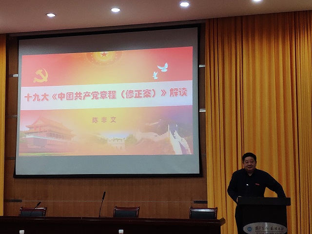 开班仪式后,以诚为本赢在信誉9001cc党委书记陈非文做了以十九大《中国共产党章程(修正案)解读》为题的专题讲座。他从为什么要修改,修改的主要内容,修改的重要意义三方面进行阐述。老师的讲解,让同学们明白了修改党章是实现党的指导思想与时俱进的客观需要;是新时代背景下推动党和国家事业发展的必然要求;是推进党的伟大工程建设的战略举措。修改的内容充实了党的指导思想、改革开放以来取得一切成绩和进步的根本原因、调整和充实了社会主义初级阶段的内容,完善了“五位一体”总体布局的内容……