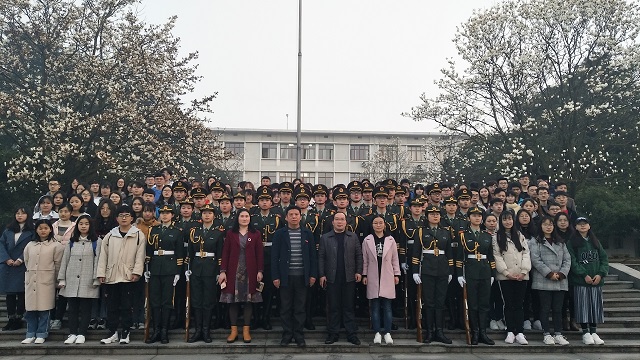 党员同志们佩戴党徽,早早地来到一教前坪集合等候,接下来的时刻是令人期待而激动的。六时四十五分许,北京路上飘扬起了豪迈的歌声,随着是湘潭大学国旗护卫队向升旗台徐徐走来,铿锵步伐、双目神炯。一切就绪,伴随着嘹亮的国歌奏唱声,鲜红的国旗冉冉升起,庄严肃穆的氛围,镌刻出了每一个人的民族自豪感。整个升旗仪式不到五分钟,却让每一个人感受到了往昔的呐喊、不屈、奋战……升旗仪式结束后,学院老师、同学与国旗护卫队合影留念,把美好的清晨定格在玉兰花香之中。