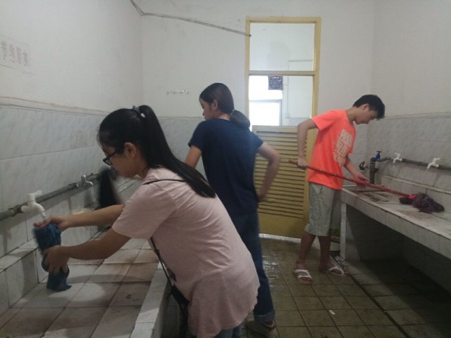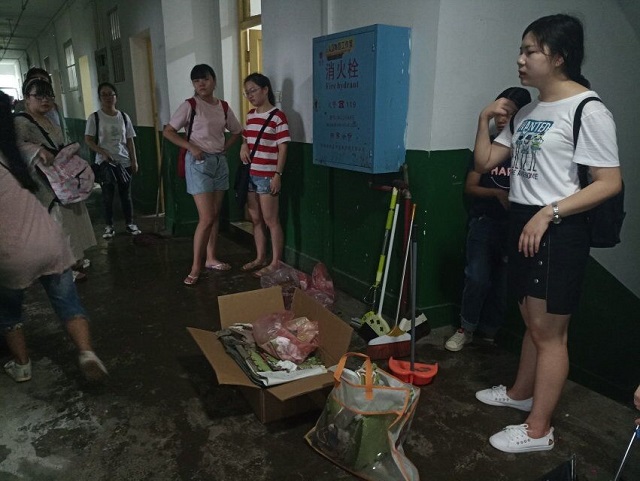 以诚为本赢在信誉9001cc上下齐心协力清除寝室灰尘,为2018级新生敞开一扇洁净温暖的大学之门。
