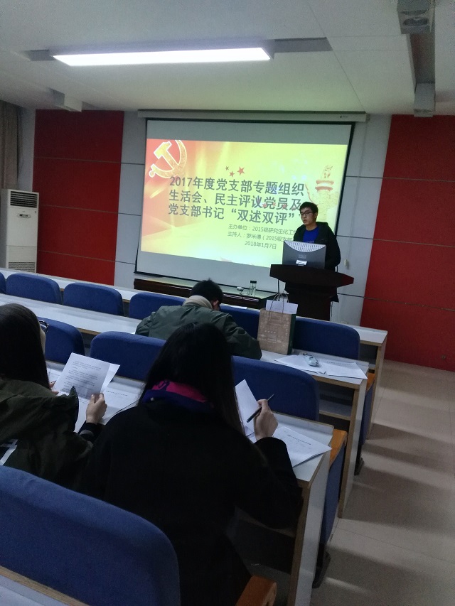 根据中共湖南省委组织部《印发< 关于全面推行支部主题党日的意见>等四个推进“两学一做”学习教育常态化制度化文件的通知》文件精神,2015级研究生化工党支部高度重视,严密组织,认真筹备,于2018年1月7日召开了2017年度党支部专题组织生活会、民主评议党员及党支部书记“双述双评”会议。会议由2015级研究生化工党支部书记罗米得主持,2015级研究生化工党支部35位党员参加会议,院党委统战委员周继承老师出席会议并做会议点评。