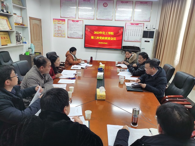 210午,学院在化学化工大楼A201会议室召开了2023年第三次党政联席会,专题学习讨论了2023年学校春季新学期工作会议精神。学院党领导班子全体成员系主任、办公室主任、专职组织员、团委书记参加了会议院党委书记陈非文主持会议。