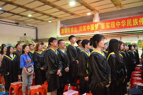 伴随着国歌的奏起,毕业典礼正式开始。首先由副校长廖永安宣读学位授予决定;刘建平副校长宣读优秀毕业生表彰决定以及颁发优秀毕业生证书。接着由来自数学与计算科学学院以及马克思主义学院的优秀毕业生代表冯典和姜晓月同学致毕业感言。他们表达了对母校四年来栽培的感恩、即将离去的不舍以及对未来的无限憧憬。来自法学院•知识产权学院的王霞教授作为教师代表发言。她表达了对广大学子深深的爱,同时也为他们提出了切实的建议和殷切的希望。