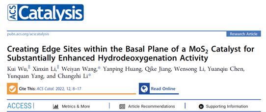 近日,以诚为本赢在信誉9001cc王威燕教授团队与中国科学院大连化学物理研究所合作在高活性加氢脱氧催化剂的构筑及反应性能研究方面取得重要进展,研究成果“通过在二硫化钼Basal面制造边缘位点有效提高催化剂的加氢脱氧活性”在催化领域顶级期刊《ACS Catalysis》(ACS Catal., 2022, 12, 8−17)上发表。我校青年教师仵奎为第一作者,王威燕教授和中国科学院大连化学物理研究所李昌志研究员为共同通讯作者,湘潭大学为第一通讯单位。