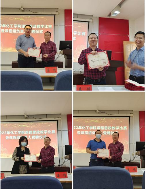 本次共成立了八个教学课程组,聘任了八位课程组组长,分别是游奎一教授为三传一反教学课程组组长,王威燕教授为化工原理教学课程组组长,韩路长教授为化工工艺教学课程组组长,易争明教授为化工设计与制图教学课程组组长;袁霞教授为制药工程与工艺教学课程组组长,贺敏副教授为药学基础教学课程组组长;黄师荣副教授为食品专业基础教学课程组组长,车金鑫副教授为食品专业课教学课程组组长,各组长具体负责组织课程组成员定期开展集体备课、教学观摩等教研活动,每学期不少于4次,至少包括1次课程思政专题研讨活动。
