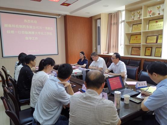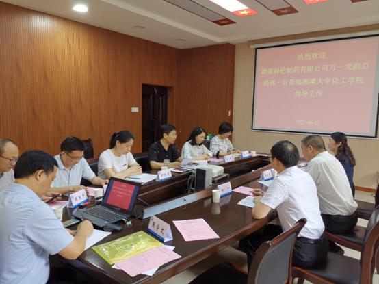 2022年6月13日下午,湖南科伦制药有限公司副总经理万一龙先生、质量部经理杨一先生、人事部经理周慧女士一行到访我院,就校企合作事宜进行初步洽谈。我院副院长易争明教授、副院长郝芳教授、党委副书记尹秋香、我系系主任吴志民教授、制药工程专业负责人袁霞教授及部分制药工程教师代表参加了此次座谈会,会议由易争明副院长主持。