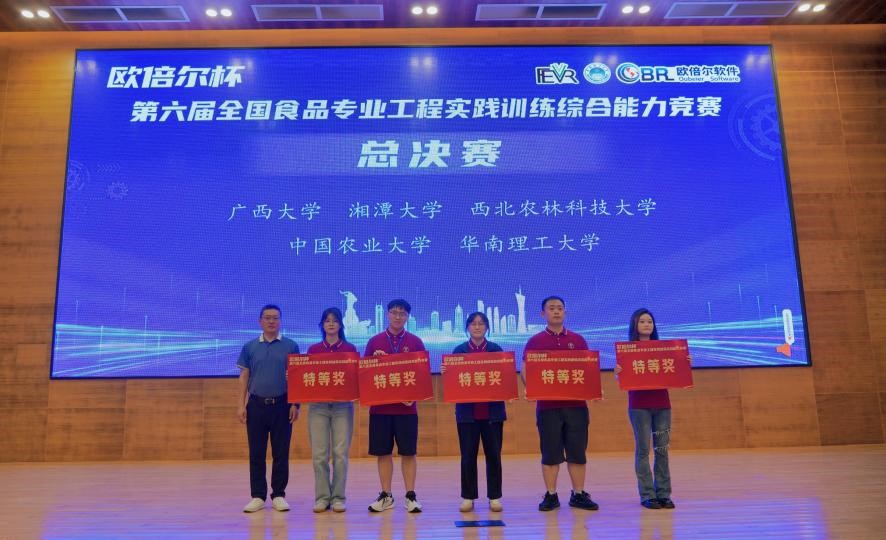 “欧倍尔杯”第六届全国食品专业工程实践训练综合能力竞赛总决赛于2024年8月20日至22日在华南理工大学(五山校区)举办。由我院车金鑫、陈秀梅和陈东方三位指导老师和2021级食品科学与工程专业张蕙芸、李萍、林梦彤组成的湘潭大学代表队荣获全国总决赛特等奖。